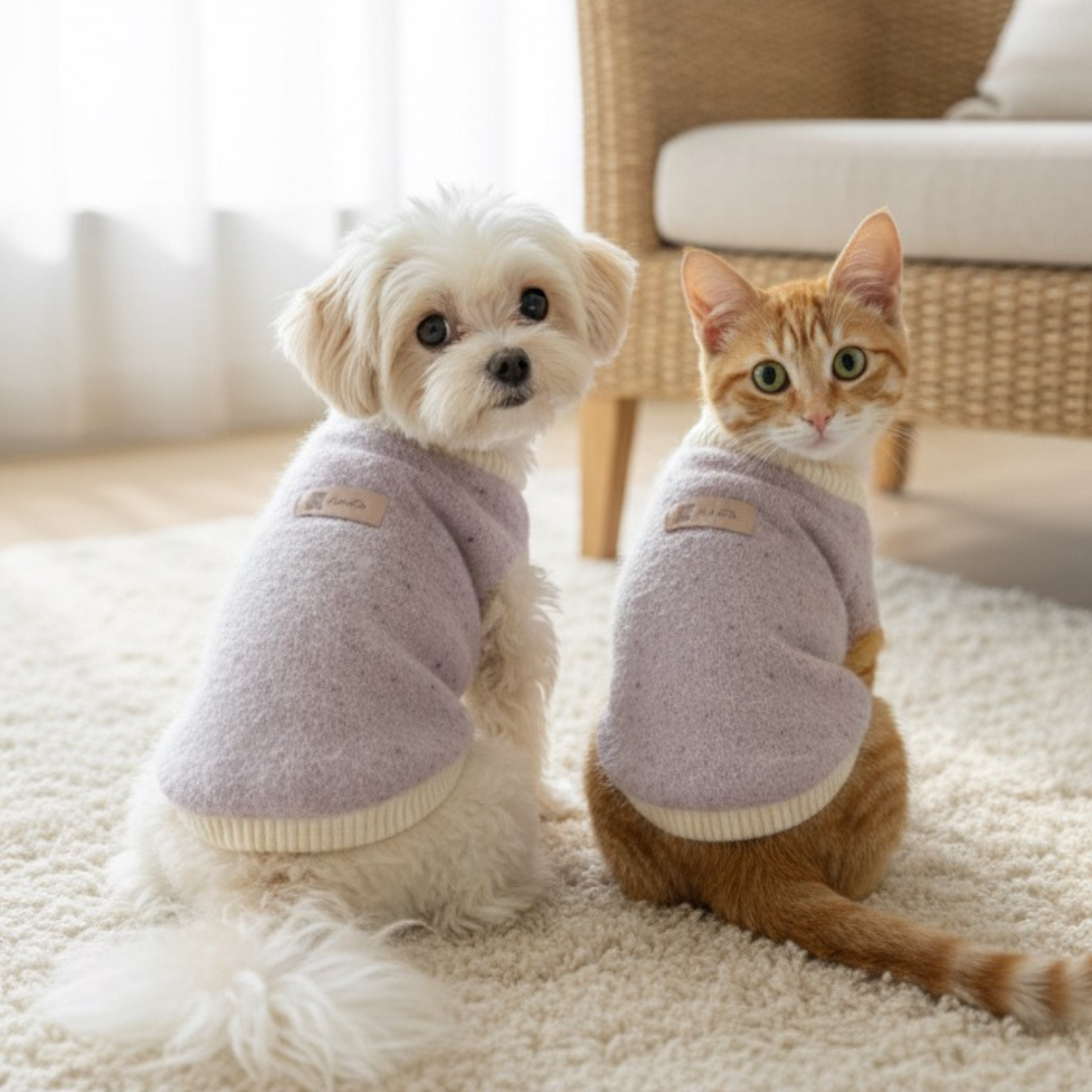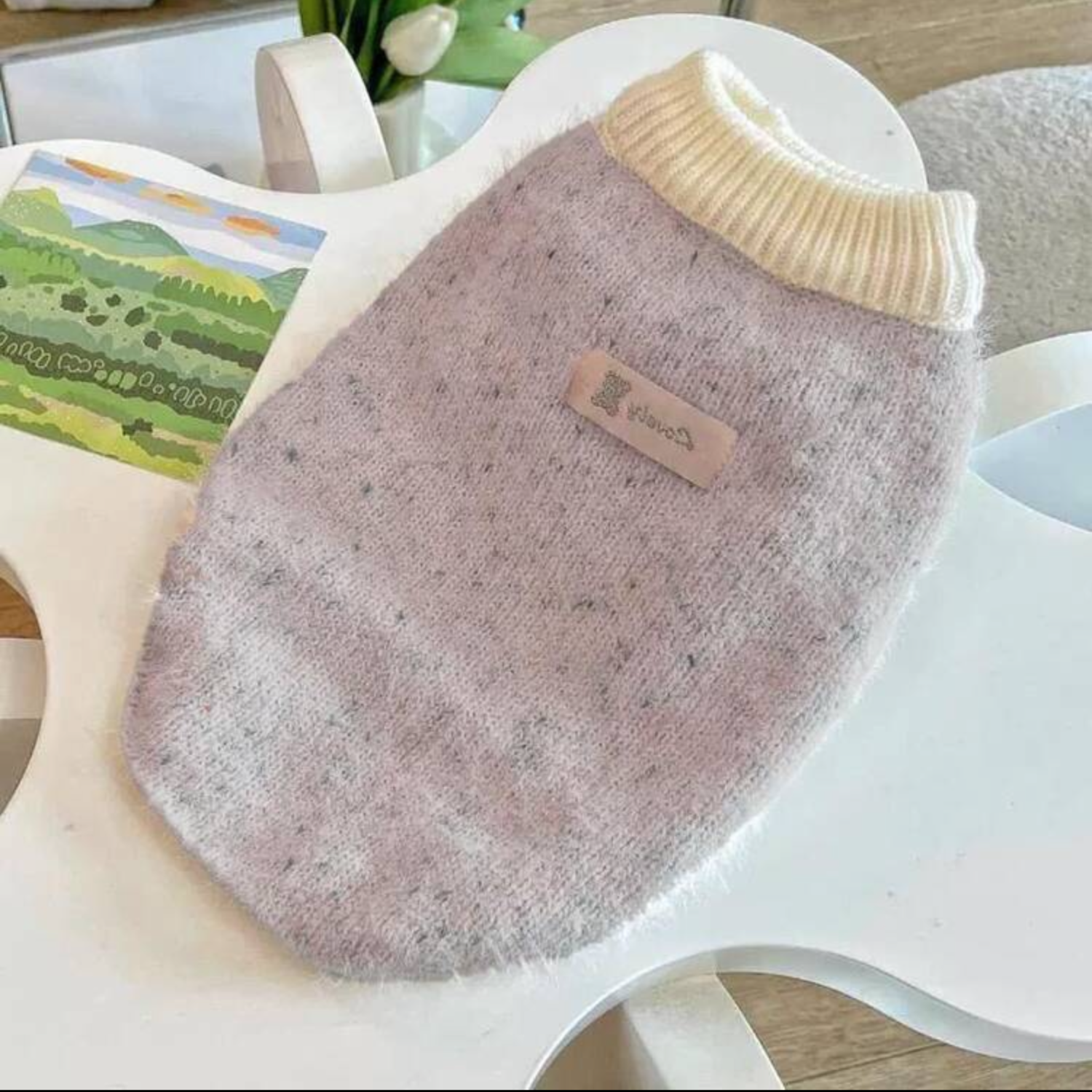 Wrap your furry friend in cozy comfort this Autumn and Winter! This adorable light purple pet sweater features a soft, flecked knit fabric and a warm, ribbed cream collar for ultimate warmth and style. Perfect for both dogs and cats, the comfortable pullover design is a cold-weather essential. Dress your pets in matching style!