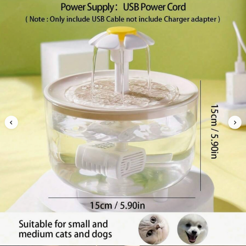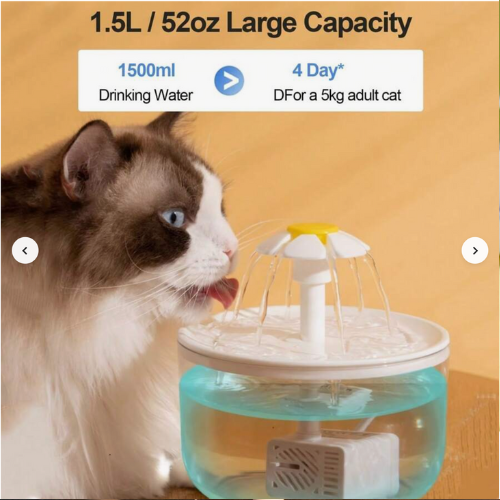 This 1.5L transparent water fountain gives your pet a steady flow of clean, oxygenated water. The built-in filter removes impurities, while the silent pump keeps the fountain running quietly day and night. The flower faucet design makes drinking easier and more fun for pets who love running water.